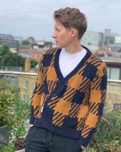 His latest creation is an Alpaca and Merino blend cardigan for his husband Dustin and we are nothing but impressed.